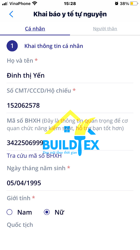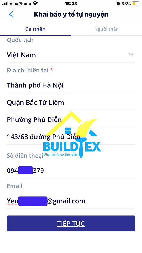 Bước 6: Vào phần "Khai báo y tế tự nguyện". Trong màn hình Thông tin khai báo y tế tự nguyện, trước tiên bạn cần nhập các thông tin cá nhân của mình vào tờ khai y tế trên ứng dụng NCOVI. Các mục được đánh dấu * là bắt buộc. Điền thông tin cá nhân và nhấn "Tiếp tục"