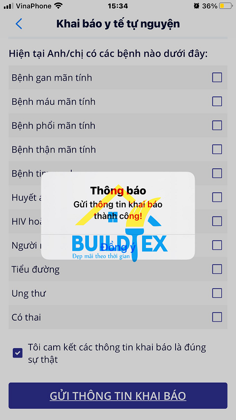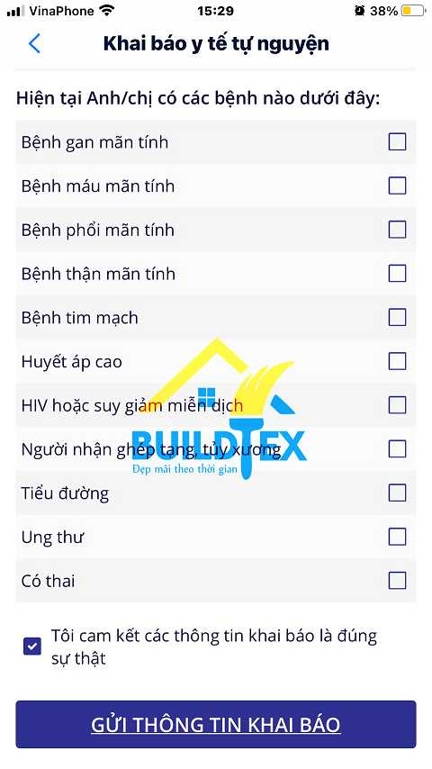 Bước 7: Hệ thống chuyển bạn qua màn hình Khảo sát bệnh. Tại đây bạn cũng trả lời các câu hỏi khai báo y tế trên ứng dụng NCOVI. Sau đó đánh dấu vào ô "Tôi cam kết các thông tin khai báo là đúng sự thật". Nhấn "Gửi thông tin khai báo" để hoàn thành.